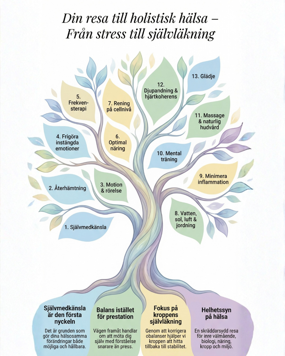 Hälsa som helhet är att ge alla olika delar rätt näring och omtanke för att vi ska må bra. Här fokuserar vi inte på det som inte fungerar (även om det såklart är vår utgångspunkt) utan vi fokuserar på att hjälpa kroppen till balans och självläkning.